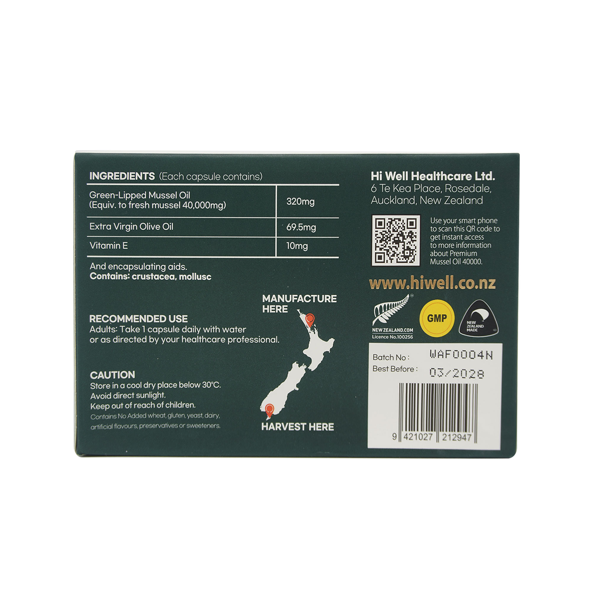 Green-Lipped Mussel Oil 320mg (Equiv. to fresh mussel 40,000mg), Extra Virgin Olive Oil 54mg, Vitamin E 10mg, Vitamin D3 0.3mcg, and encapsulating aids.