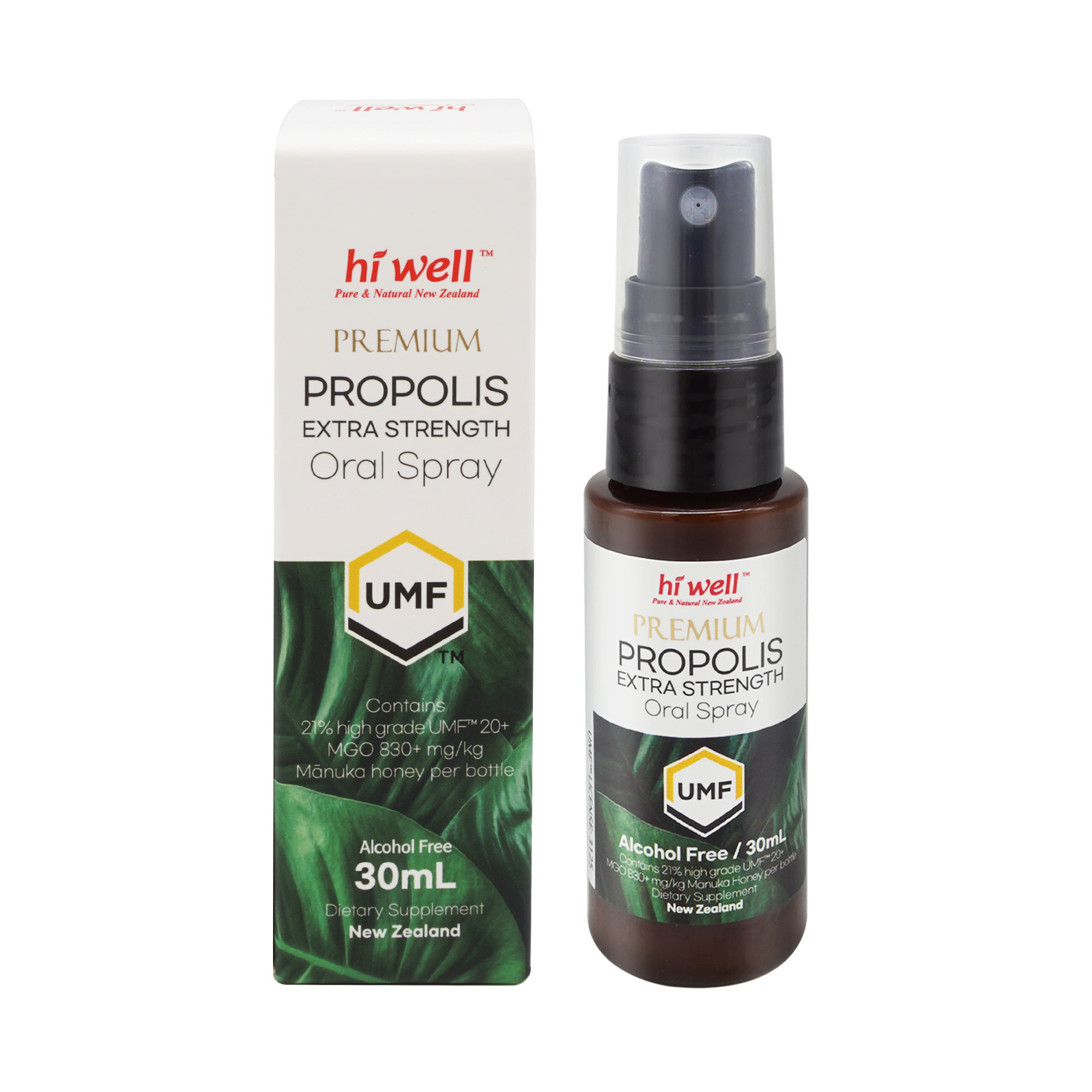 Propolis (NZ Propolis Extract 25%), 21% UMF 20+/MGO 830+ NZ Manuka Honey, Peppermint Oil, Lemon Oil, Clove Oil, Purified Water, Glycerin, Lecithin